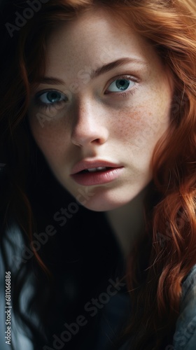 a close up of a woman with freckles on her face and freckles on her hair, looking at the camera with a serious look on her face.