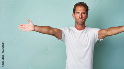A man, dressed in a white T-shirt, extends his arms before the camera, hands out