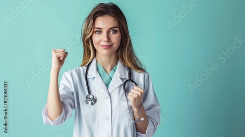 A woman doctor holds a stethoscope in one hand and makes a fist with the other