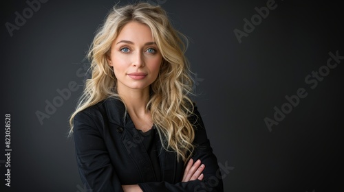 A woman in a black shirt crosses her arms over her chest, her long blonde hair framing her face