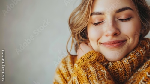 A woman with closed eyes wears a yellow knitted scarf and smiles in this close-up image