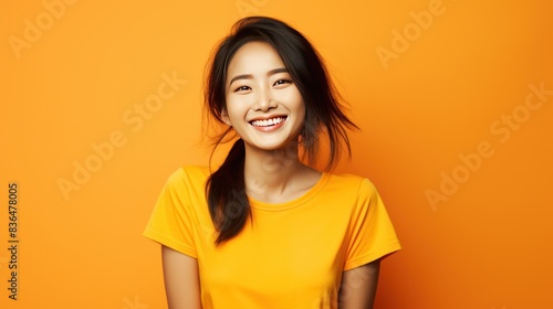 a young Asian woman with a bright smile wearing a yellow t-shirt