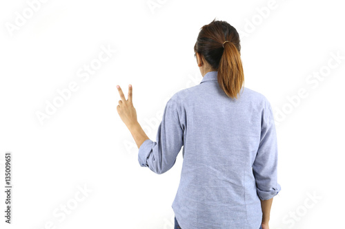 back women showing v-sign victory or peace with fingers hand ge