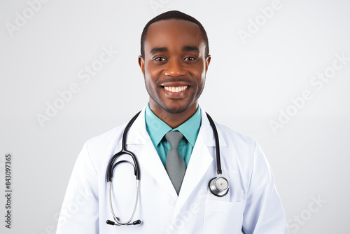 Black smiling doctor on a white background. World of Medicine. Personal care profession. Medical studies. Afro american doctor. Africa. Images for graphic designers. Image for communication. AI.