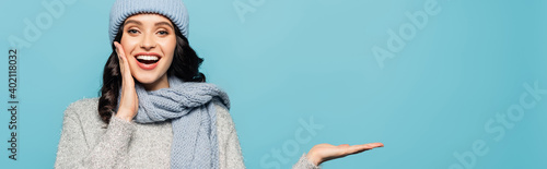 brunette woman with open mouth wearing winter outfit and pointing with hand isolated on blue, banner