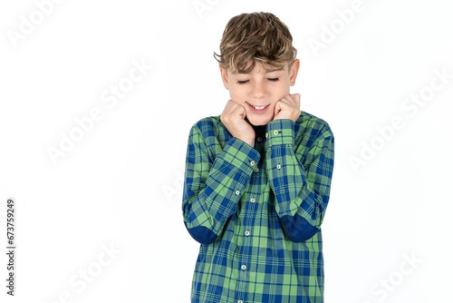 Caucasian teen boy wearing plaid shirt grins joyfully, imagines something pleasant, copy space. Pleasant emotions concept.