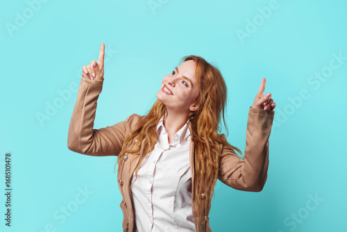 Confident young woman smiling and pointing with finger against bright blue background