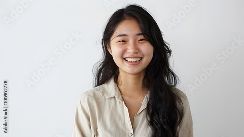 Happy Asian young woman with black long hair, wearing a casual shirt, smiling and standing proudly with a cheerful gesture, looking at the camera against a white background