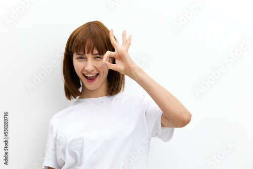 photo of a funny, cute woman showing an ok sign near her eye while leaning towards the camera