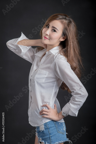 Portrait of model beautiful girls wearing White shirt and short jeans in clean skin beautiful and smart concept with Black .fabric background