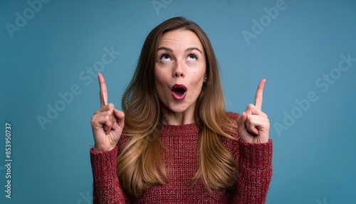 Portrait of nice astonished person open mouth direct fingers up empty space proposition isolated on blue color background