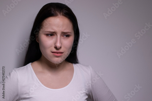 portrait of sad and depressed young woman. on gray background. nervous and upset people concept.