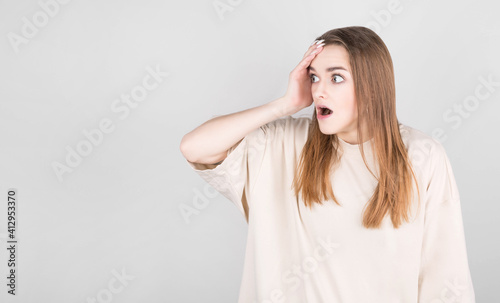 shocked woman holding her mouth wide open, looking away with a displeased expression, holding her head