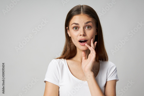 woman with open mouth holds her hand Will appear on a light background Copy Space