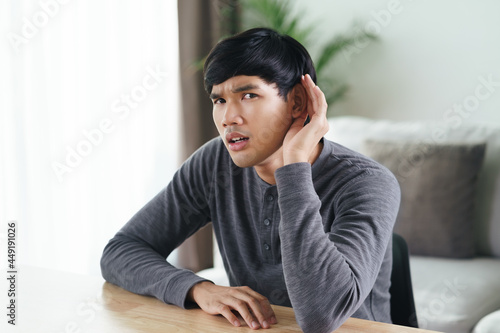 Young Asian deaf disabled man having hearing problems holds his hand over the ear, listens carefully, hard of hearing..