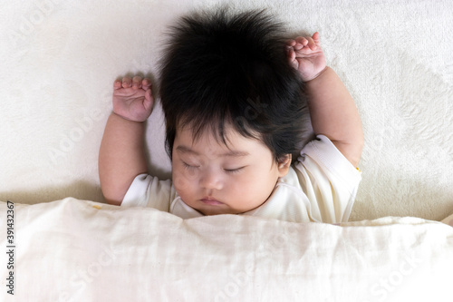 布団をかぶって寝ている赤ちゃんの顔、0歳、生後4か月、女の子