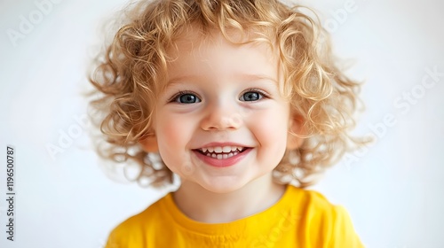 1. A young child with curly hair, wearing a yellow shirt, smiling happily on a white background
