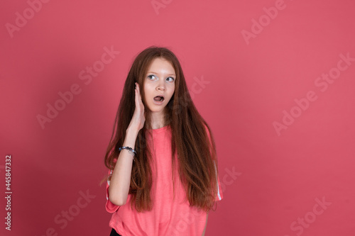 13 years old girl kid in casual isolated on terracotta background gossip listening hand by ear