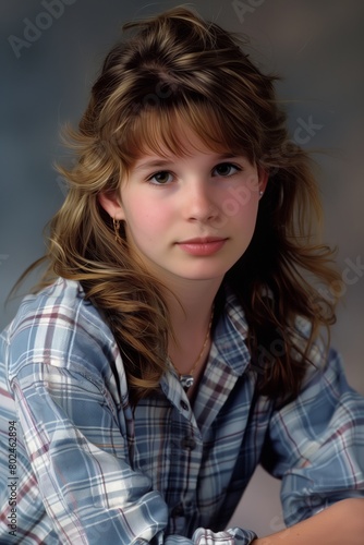 1980s style Yearbook headshot of a pretty high school teenage girl looking at the camera