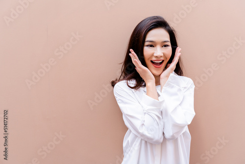 20s young Asian happy millenial woman in white shirt in clean background smiling and laughing confidently with beautiful teeth. Portrait of beauty skin care and oral care concept