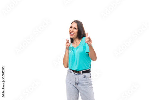 30 year old attractive brunette woman with flowing straight hair put on a blue T-shirt and jeans