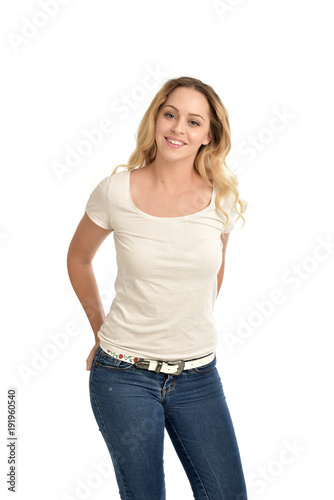 3/4 portrait of blonde girl wearing white shirt, happy expression. isolated on white background.