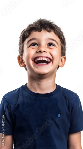 78. A boy grinning happily, wearing a navy blue t-shirt, on a white background