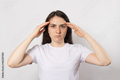 A 30-year-old brunette woman holds her hands near her temples on a white background