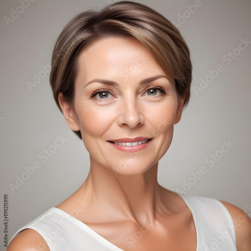 A 50 year old Caucasian lady with short brown hair and illuminated healthy complexion, showcasing smooth skin and a calm expression, reflecting the effects of a recent beauty treatment