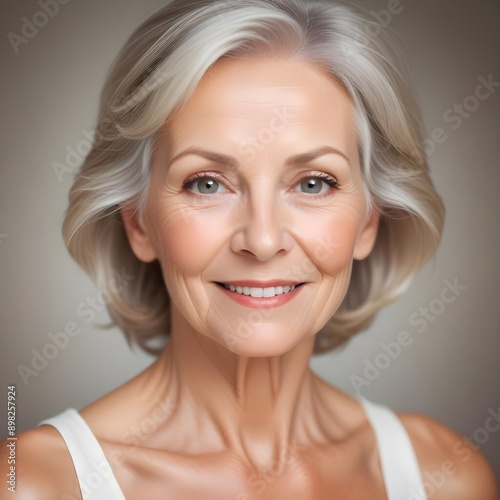 A 70 year old Caucasian lady with an illuminated, healthy complexion, showcasing smooth skin and radiant expression, reflecting the effects of a recent beauty treatment