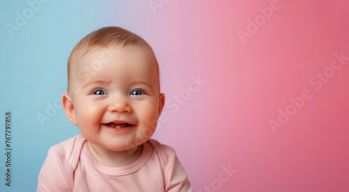 A baby is smiling and looking at the camera. baby is wearing a pink shirt. The background is a blue and pink color. Studio portrait of cute little baby infant smiling on different colours background