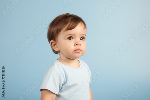 A baby is standing in front of a blue wall