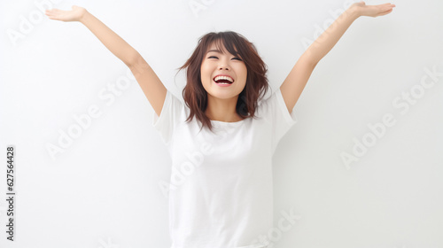 A beaming lady in a white t-shirt dress raises her arms with a relaxed smile, expressing her unbridled happiness against the pristine white backdrop. generative AI.