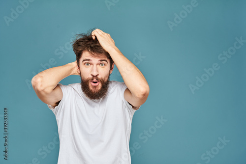 A bearded man in a white T-shirt gestures with his hands emotions blue background