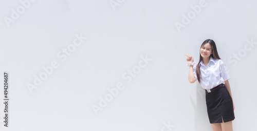 A beautiful Asian girl in a cheerful school uniform is smiling and showing her finger to present some product with a white background.