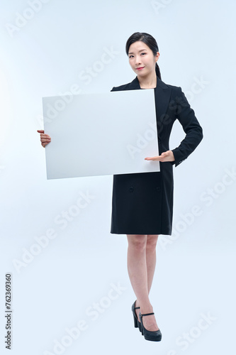 A beautiful Asian woman in a business suit is holding a white board and making various expressions and gestures.