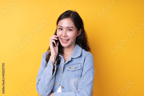 A beautiful Asian woman use phone is thrilled by the news with a bright orange background. The woman say wow and enjoyed the destination line on the phone.
