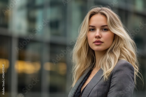 A beautiful blonde caucasian european woman in suit outdoors with a blurry business