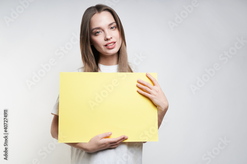 A beautiful blonde in a white T-shirt on a gray background holds a yellow sign