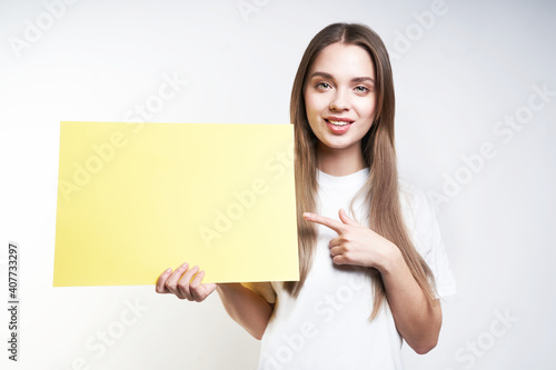 A beautiful blonde in a white T-shirt on a gray background holds a yellow sign