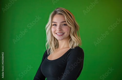 A beautiful blonde woman in her late twenties posing for the camera while talking and smiling, wearing a black long-sleeved top with a visible navel piercing, against a green screen background