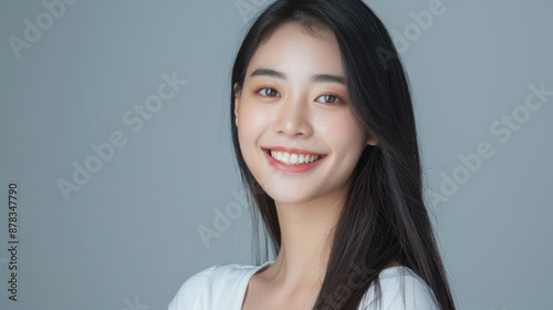 A beautiful Chinese woman with long hair, posing for the camera in white and smiling at her face