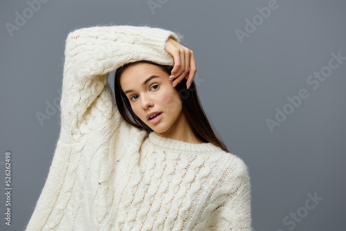 a beautiful, gentle, sophisticated woman with long hair stands in a stylish sweater on a gray studio background touching her head with her hand