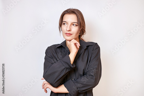 A beautiful girl in a black shirt stands with her hands folded in front of her.