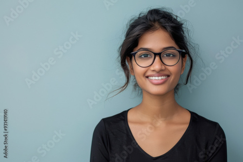 A beautiful Indian woman wearing glasses smiles and poses on light blue background.