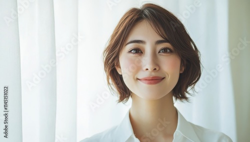 A beautiful Japanese woman with short hair smiles in front of white curtains.