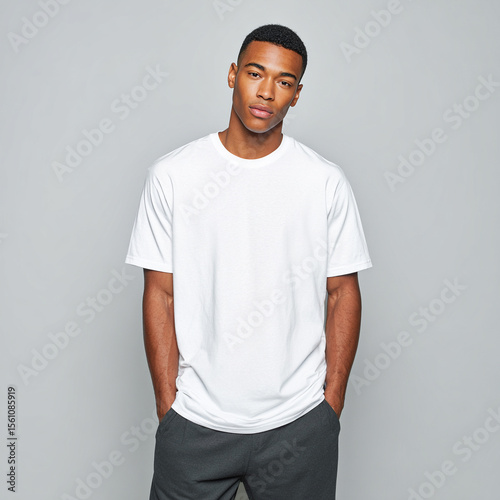 A beautiful male model wearing a white t-shirt. A product shot for fashion and apparel. best use for mockup.