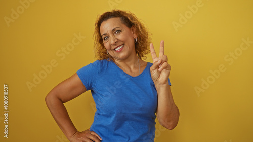 A beautiful middle-aged hispanic woman with curly hair and a blue shirt smiles and makes a peace sign while standing against a yellow wall.