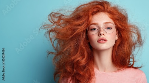 A beautiful model with striking red hair and glasses poses against a bright blue background, showcasing her voluminous curls and captivating gaze in a vibrant atmosphere.