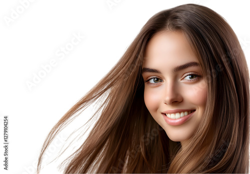 a beautiful, smiling woman with long, straight hair looking at the camera, isolated on a white background
